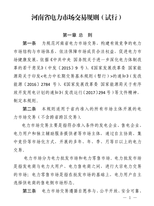 河南省日前發(fā)布了《河南省電力市場交易規(guī)則(試行)》