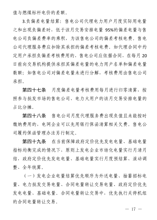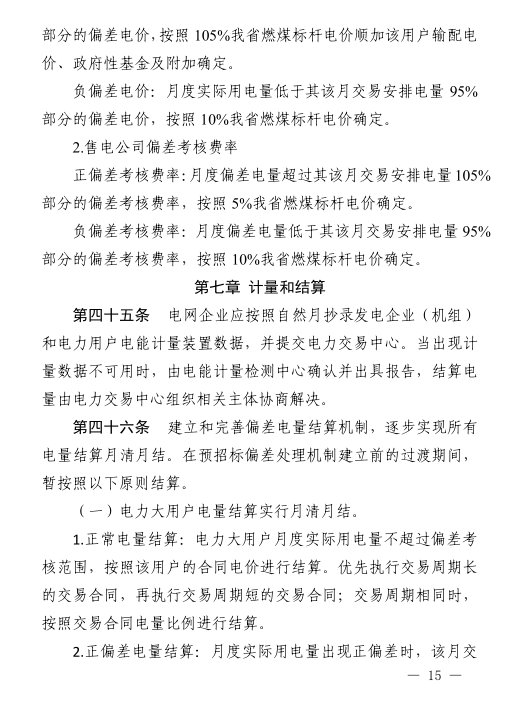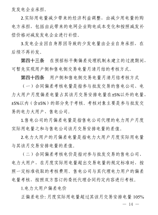 參與批發(fā)交易的售電公司、電力大用戶月度偏差電量占其該月交易安排電量在±5以外的電量,±5%以內(nèi)(含±5%)的部分免于考核。考核對象為參與批發(fā)交易的電力大用戶、售電公司。