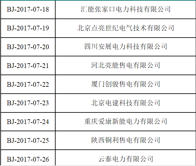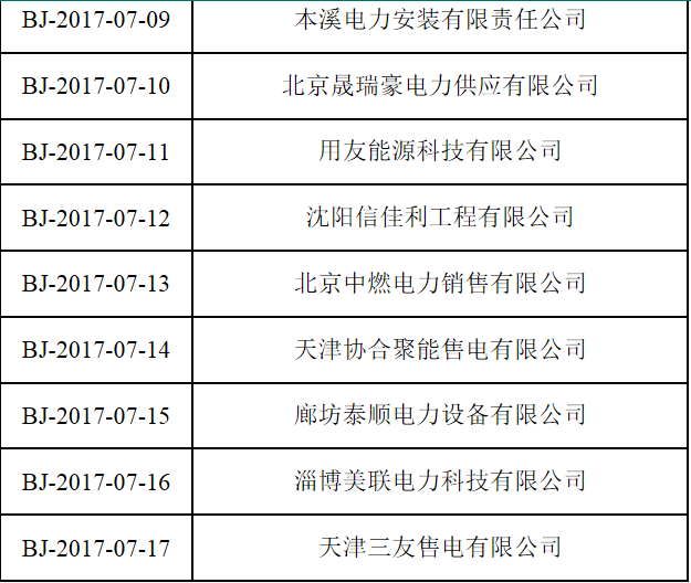 按照國(guó)家發(fā)改委、國(guó)家能源局《售電公司準(zhǔn)入與退出管理辦法》的要求,北京電力交易中心受理了下列售電公司的注冊(cè)申請(qǐng),對(duì)售電公司提交的市場(chǎng)準(zhǔn)入申請(qǐng)材料進(jìn)行了完整性核驗(yàn),現(xiàn)將企業(yè)名單及基本情況予以公示。