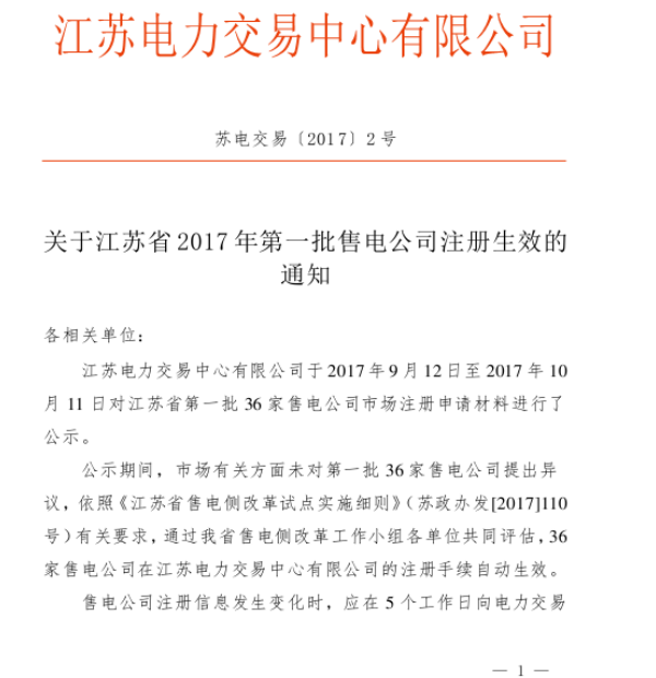 2017年10月12日,江蘇電力交易中心發(fā)布第一批售電公司注冊生效的通知。2017年9月12日-2017年10月11日,江蘇省對華能江蘇能源銷售有限責(zé)任公司、華能江蘇能源有限公司、國家電投集團江蘇綜合能源供應(yīng)有限公司等第