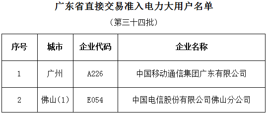 廣東省經(jīng)信委日前發(fā)布了第三十四批直接交易準入電力大用戶名單,認定中國移動通信集團廣東有限公司等兩家電力大用戶符合與發(fā)電企業(yè)直接交易擴大試點準入條件,詳情如下: