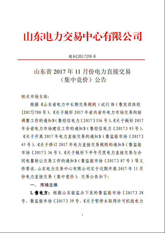 10月19日,山東電力交易中心發(fā)布了關(guān)于2017年11月份電力直接交易(集中競(jìng)價(jià))公告,根據(jù)山東省電力直接交易工作安排,現(xiàn)組織開(kāi)展2017年11月份電力直接交易(集中競(jìng)價(jià)),交易周期2017年11月。10月20日14:00至17:00,