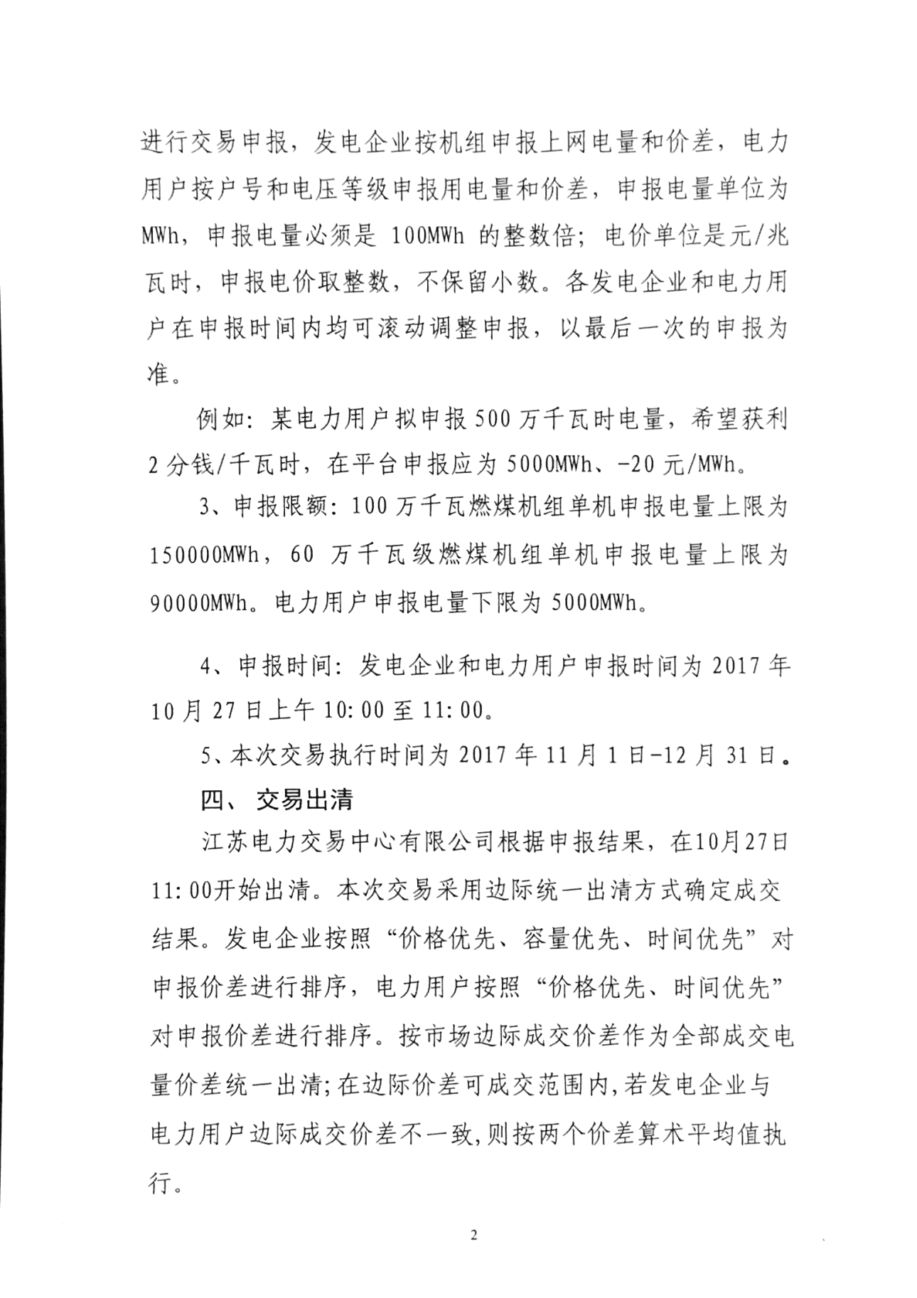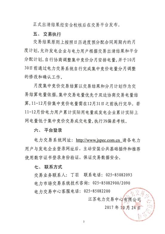 江蘇電力交易中心有限公司根據(jù)申報(bào)結(jié)果,在10月27日11:00開始出清、本次交易采用邊際統(tǒng)一出清方式確定成交結(jié)果。11至12月份集中競(jìng)價(jià)電量需在12月31日之前執(zhí)行完畢。若11至12月份電力用戶累計(jì)實(shí)際用電量或發(fā)電企業(yè)累計(jì)實(shí)際上網(wǎng)電量低于集中競(jìng)價(jià)交易成交電量,執(zhí)行3%偏差考核。
