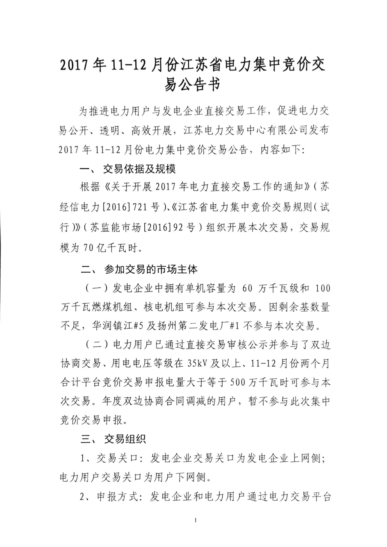 10月24日,江蘇電力交易中心公布了2017年11至12月份江蘇省電力集中競(jìng)價(jià)交易公告書,交易規(guī)模為70億千瓦時(shí),申報(bào)時(shí)間:發(fā)電企業(yè)和電力用戶申報(bào)時(shí)間為2017年10月27日上午10:00至11:00,本次交易執(zhí)行時(shí)間為2017年11月1日至12月31日。