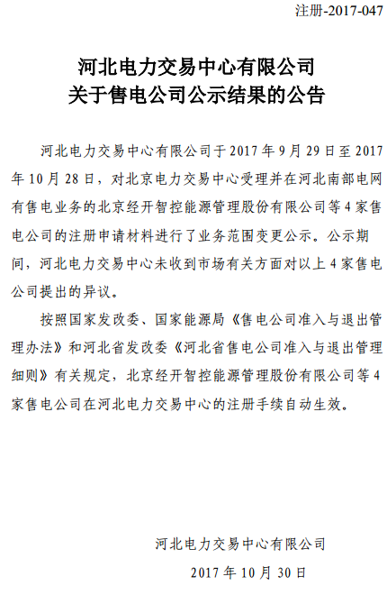 河北電力交易中心有限公司于2017年9月29日至2017年10月28日, 對(duì)北京電力交易中心受理并在河北南部電網(wǎng)有售電業(yè)務(wù)的北京經(jīng)開(kāi)智控能源管理股份有限公司等4家售電公司的注冊(cè)申請(qǐng)材料進(jìn)行了業(yè)務(wù)范圍變更公示。公示期間, 河北電力交易中心未收到市場(chǎng)有關(guān)方面對(duì)以上4家售電公司提出的異議,注冊(cè)手續(xù)自動(dòng)生效。