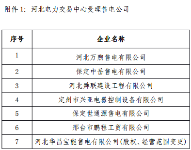 11月17日,河北電力交易中心發(fā)布了《關(guān)于售電公司公示結(jié)果的公告》,公告稱10月17日至11月16日,河北電力交易中心受理河北萬煦售電有限公司等7家售電公司,以及北京電力交易中心受理并在河北南部電網(wǎng)有售電業(yè)務(wù)的