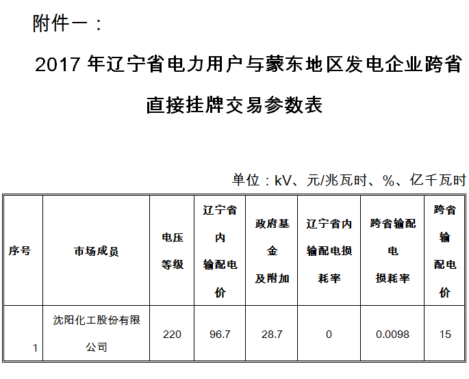 近日,遼寧電力交易中心發(fā)布了《關于開展2017年第5批遼寧省電力用戶與蒙東地區(qū)發(fā)電企業(yè)跨省直接交易的通知(沈陽化工 第一輪)》,通知稱本次交易參與的市場成員為經(jīng)政府有關部門核準的電力用戶和火電企業(yè)。其中: