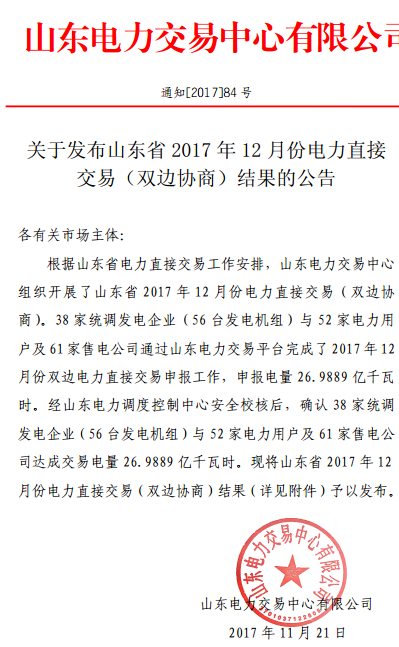 11月21日,山東電力交易中心發(fā)布了《12月份電力直接交易(雙邊協(xié)商)結(jié)果的公告》,公告稱38家統(tǒng)調(diào)發(fā)電企業(yè)(56臺發(fā)電機(jī)組)與52家電力用戶以及61家售電公司通過山東電力交易平臺完成了2017年12月份雙邊電力直接