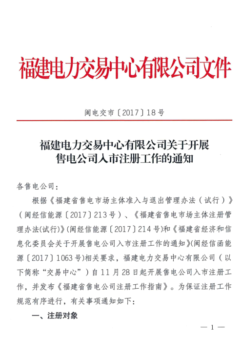 福建電力交易中心11月28日發(fā)布了《關(guān)于開展售電公司入市注冊工作的通知》,通知中稱,自11月28日起開展售電公司入市注冊工作,欲納入首批注冊名單的售電公司應(yīng)于12月6日之內(nèi)完成網(wǎng)上注冊申請工作。并發(fā)布《福建省