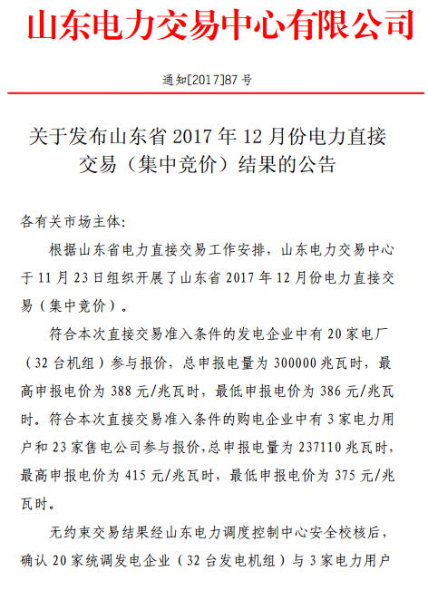 山東電力交易中心發(fā)布《12月份電力直接交易(集中競價(jià))結(jié)果的公告》
