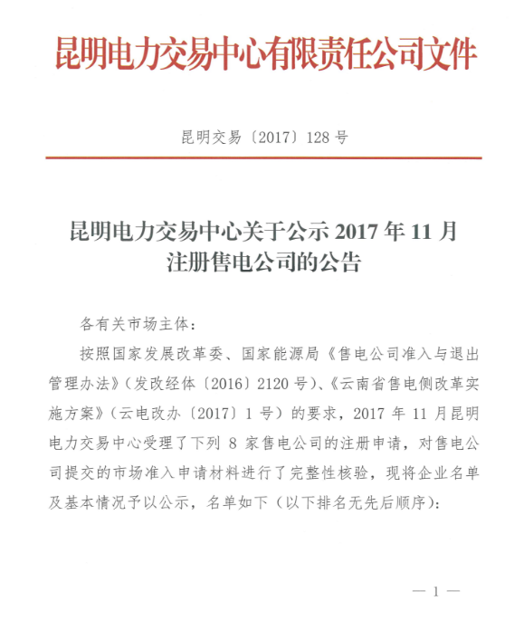 近日,昆明電力交易中心發(fā)布了《關(guān)于公示2017年11月注冊售電公司的公告》,公告稱中心受理了下列8家售電公司的注冊申請,公示期為12月1日至2018年1月1日,時(shí)間為一個(gè)月。