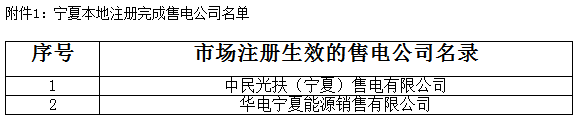 按照國家發(fā)改委、國家能源局《售電公司準(zhǔn)入與退出管理辦法》、寧夏經(jīng)濟和信息化委員會《寧夏回族自治區(qū)售電公司準(zhǔn)入與退出管理實施細則(試行)》有關(guān)規(guī)定,寧夏電力交易中心受理的中民光扶(寧夏)售電有限公司等共2家售電公司的注冊手續(xù)自動生效;北京交易中心推送的天津友宏恒業(yè)電力科技有限公司等共2家售電公司在寧夏電力交易中心的注冊手續(xù)自動生效、國投甘肅售電有限公司共1家售電公司業(yè)務(wù)范圍變更生效,待售電公司通過自治區(qū)經(jīng)信委備案后,納入自主交易市場主體目錄。國家電投寧夏電能配售電有限公司共1家售電公司注冊信息變更生效。