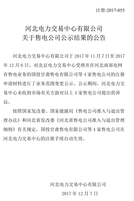 河北電力交易中心日前發(fā)布了關(guān)于售電公司公示結(jié)果的公告,公告中稱,國(guó)投甘肅售電有限公司等4家售電公司在河北電力交易中心的注冊(cè)手續(xù)自動(dòng)生效。
