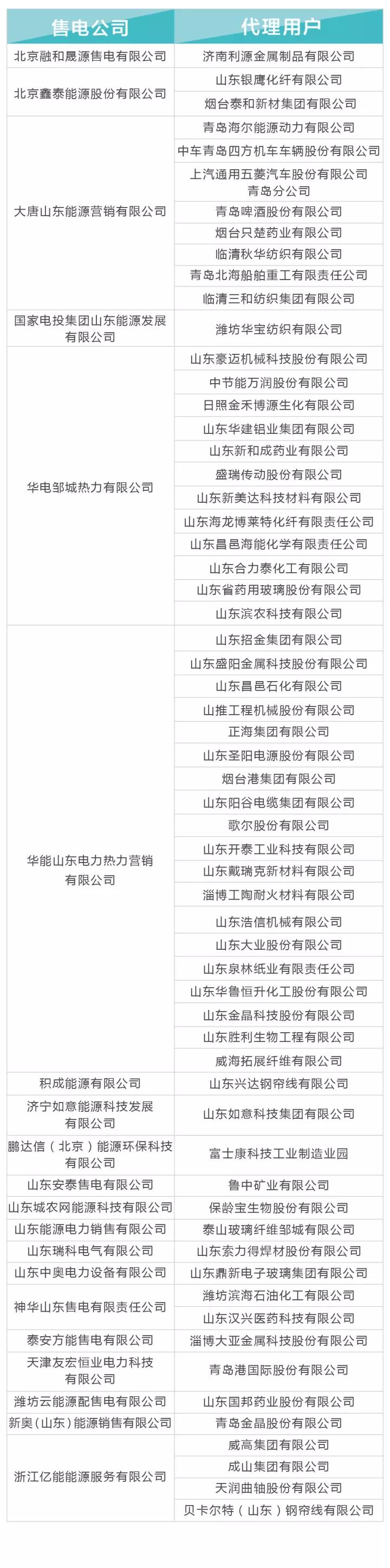 山東售電公司與跨省區(qū)電力直接交易用戶代理關(guān)系及自主參加交易的電力用戶名單