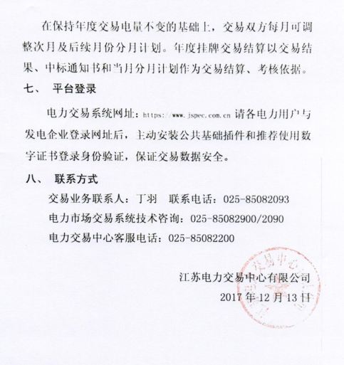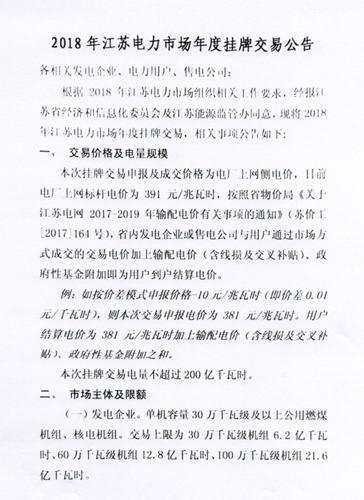 江蘇電力交易中心發(fā)布2018年江蘇電力市場年度掛牌交易公告