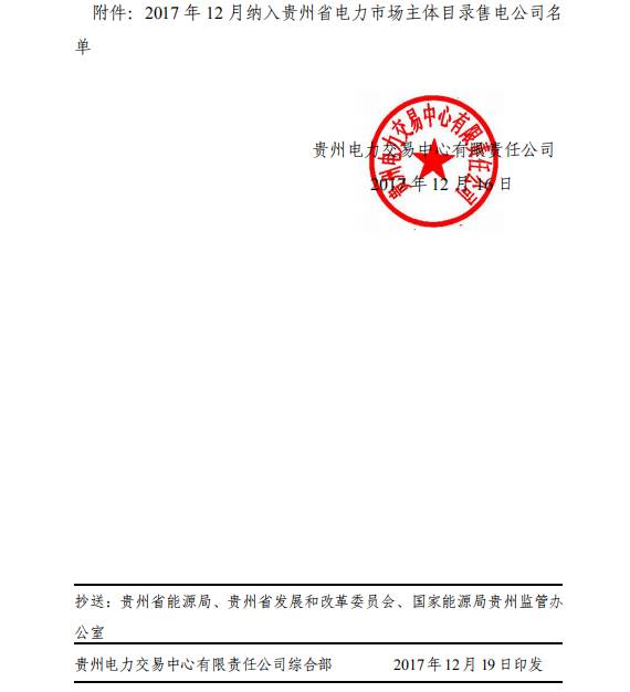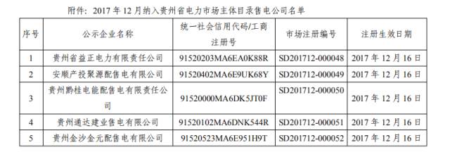 貴州省2017年12月納入電力市場(chǎng)主體目錄售電公司名單