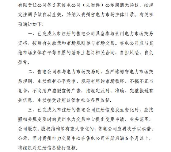貴州電力交易中心日前公布了2017年12月納入貴州省電力市場(chǎng)主體目錄售電公司名單,貴州省益正電力有限責(zé)任公司等5家售電公司公示期滿(mǎn)無(wú)異議。詳情如下: