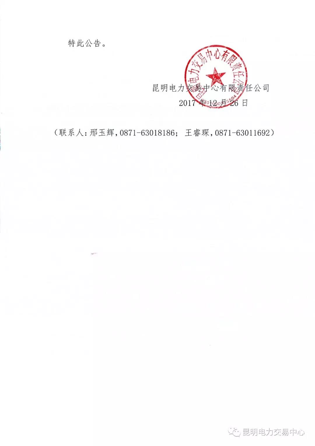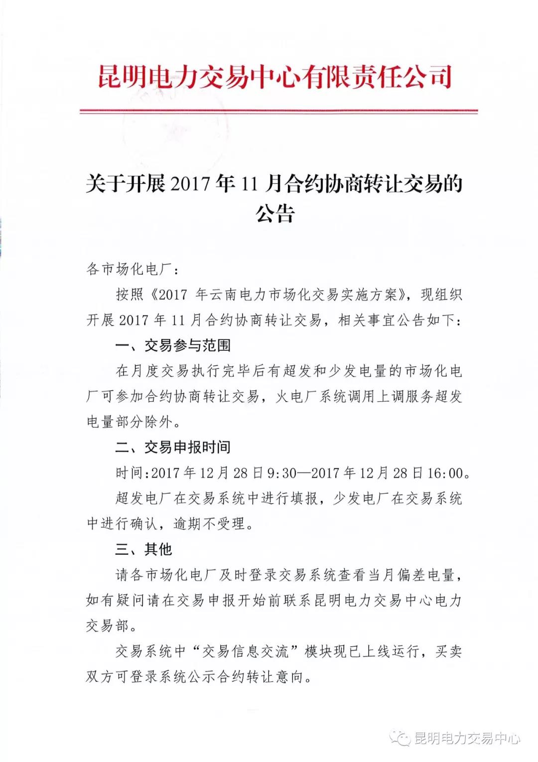 昆明電力交易中心日前發(fā)布了《關(guān)于開展2017年11月合約協(xié)商轉(zhuǎn)讓交易的公告》,公告中稱,將于2017年12月28日9:30-2017年12月28日16:00進行2017年11月合約協(xié)商轉(zhuǎn)讓交易。本次交易參與范圍是:在月度交易執(zhí)行完畢