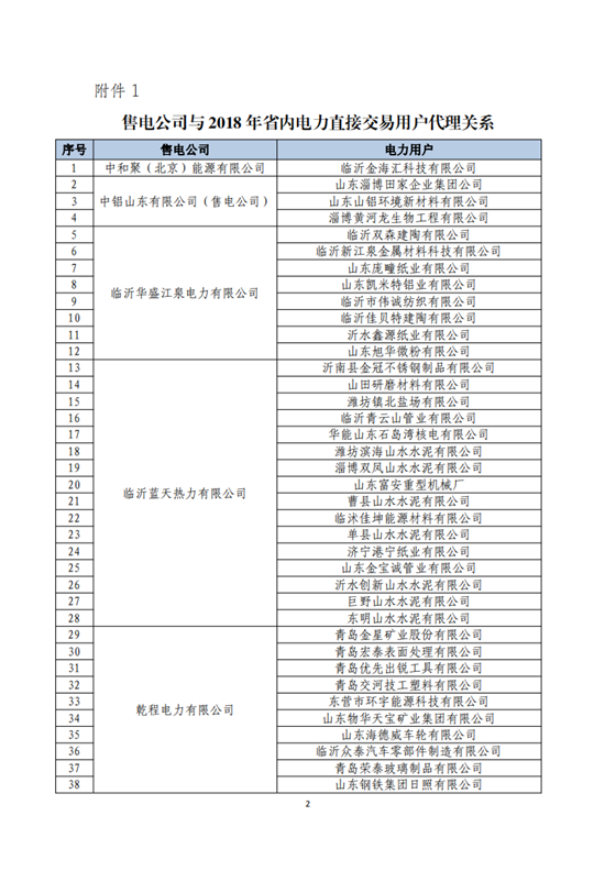 山東2018年省內(nèi)電力交易用戶(hù)與售電公司代理關(guān)系及自主參與直接交易用戶(hù)名單
