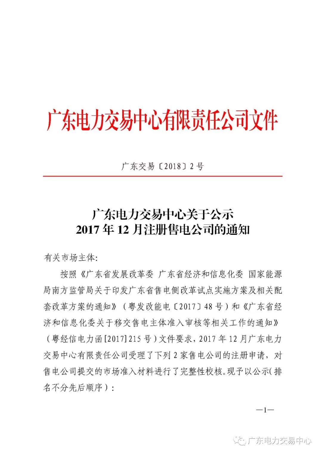 廣東電力交易中心日前發(fā)布了《關(guān)于公示2017年12月注冊售電公司的通知》,通知中稱,2017年12月廣東電力交易中心受理了2家售電公司的注冊申請,公示期為2018年1月5日至2018年2月4日。詳情如下: