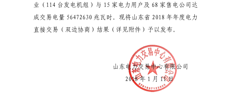 《關于發(fā)布山東省2018年年度電力直接交易(雙邊協(xié)商)結果的公告》