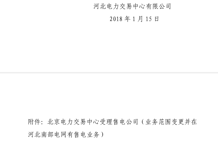 河北電力交易中心于2017年12月15日至2018年1月14日,對北京電力交易中心受理寧浩在河北南部電網(wǎng)有售電業(yè)務(wù)河北建睿電力科技有限公司等2家售