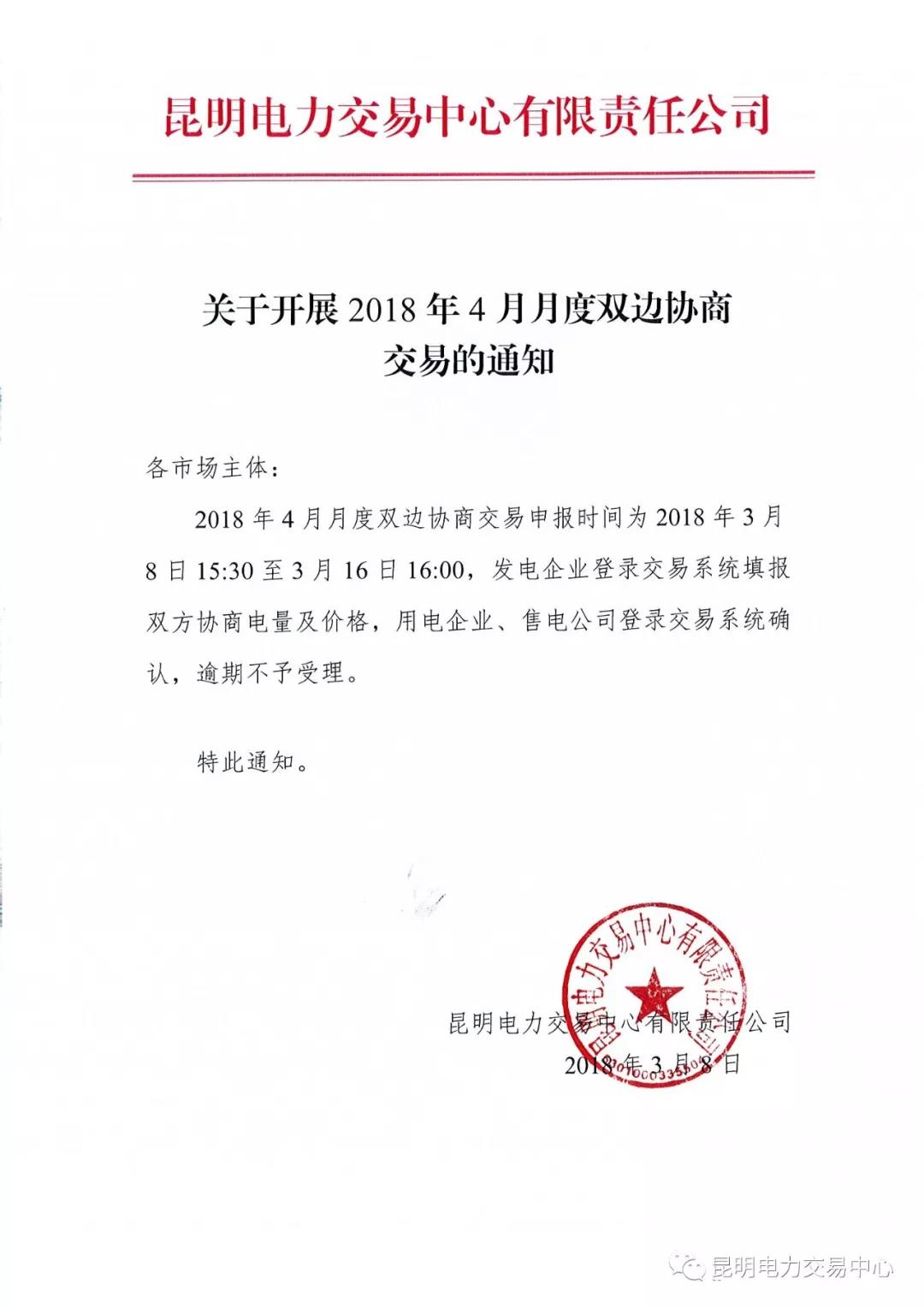 昆明電力交易中心日前發(fā)布了《關(guān)于開展2018年4月月度雙邊協(xié)商交易的通知》,通知中稱,4月月度雙邊協(xié)商交易申報(bào)時(shí)間為3月8日15:30至3月16日16:00。詳情如下: