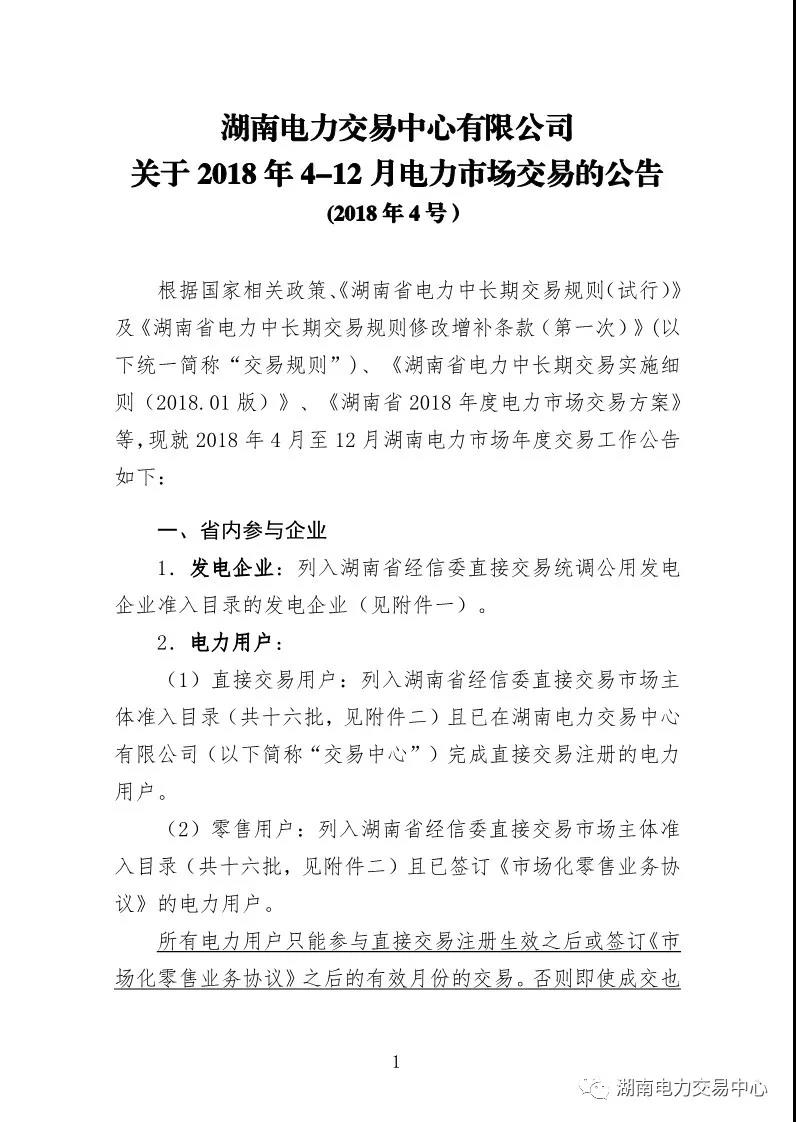 湖南電力交易中心日前發(fā)布了《關(guān)于2018年4-12月電力市場交易的公告》,公告中稱,本次交易電量對應(yīng)的周期為2018年4月-12月,按月申報并進行