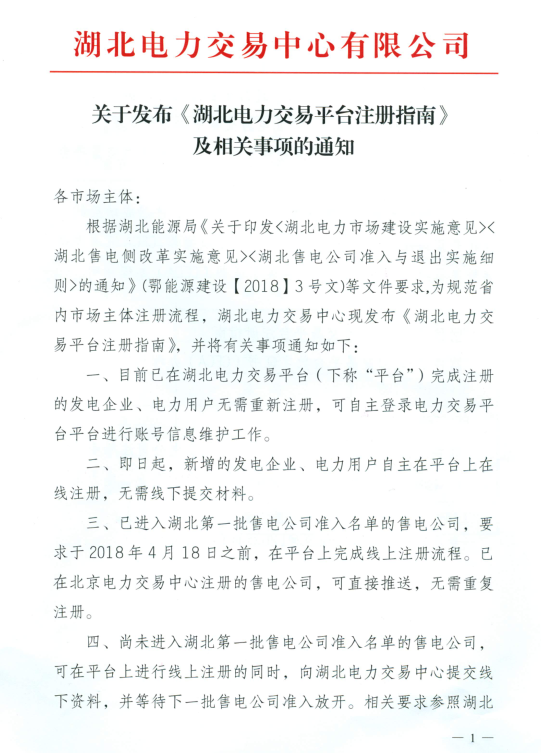 湖北電力交易中心日前發(fā)布了《湖北電力交易平臺(tái)注冊(cè)指南》及相關(guān)事項(xiàng)的通知,已進(jìn)入湖北第一批售電公司準(zhǔn)入名單的售電公司,要求于2018年4