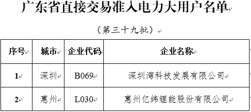 廣東省經信委日前發(fā)布了《第三十九批直接交易準入電力大用戶名單的通知》,深圳灣科技發(fā)展有限公司等4家電力大用戶符合與發(fā)電企業(yè)直接交易