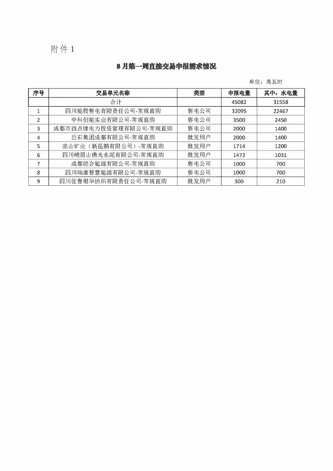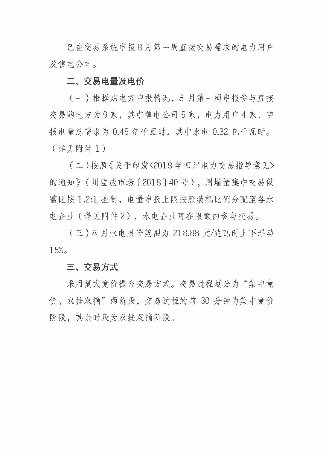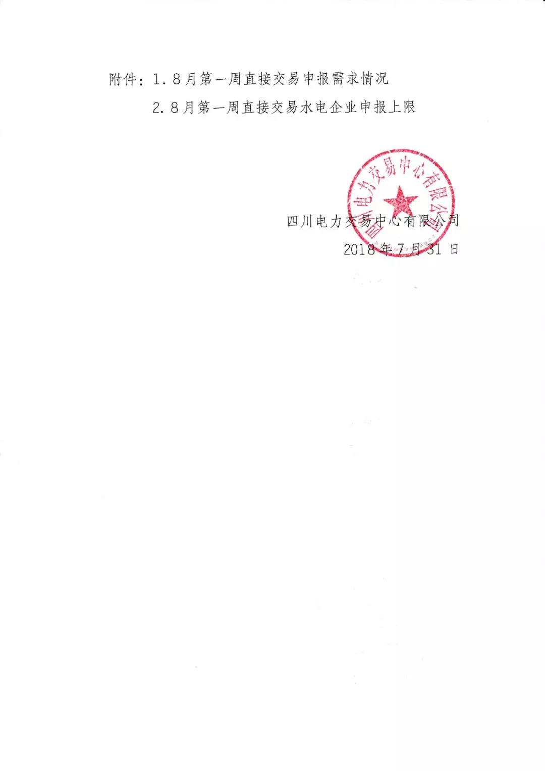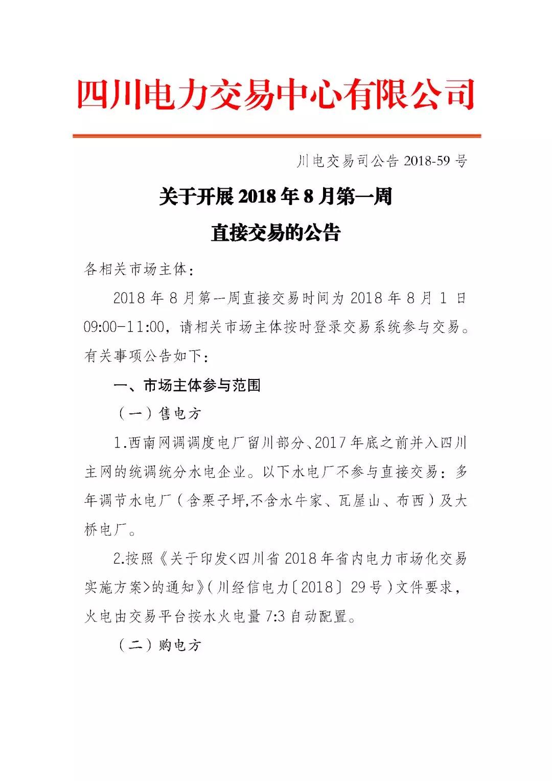 四川關(guān)于開(kāi)展2018年8月第一周直接交易的公告