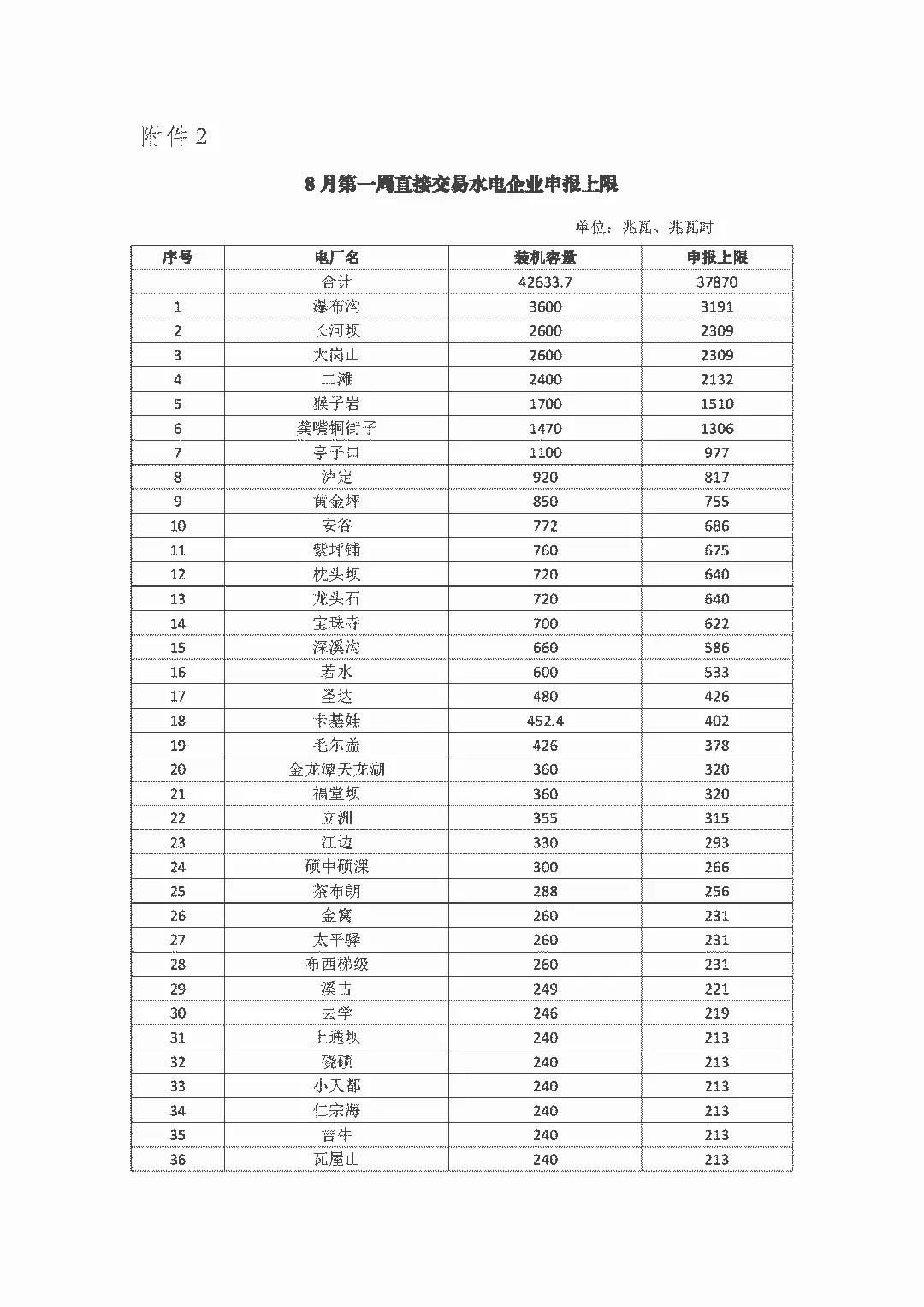 交易電量及電價(jià)(一)根據(jù)購(gòu)電方申報(bào)情況,8月第一周申報(bào)參與直接交易購(gòu)電方為9家,其中售電公司5家,電力用戶4家,申報(bào)電量總需求為0.45億千瓦時(shí),其中水電0.32億千瓦時(shí)。(二)按照《關(guān)于印發(fā)<2018年四川電力交易指導(dǎo)意見(jiàn)>的通知》(川監(jiān)能市場(chǎng)[2018]40號(hào))周增量集中交易供需比按1.2:1控制,電量申報(bào)上限按照裝機(jī)比例分配至各水電企業(yè),水電企業(yè)可在限額內(nèi)參與交易(三)8月水電限價(jià)范圍為218.88元/兆瓦時(shí)上下浮動(dòng)15%