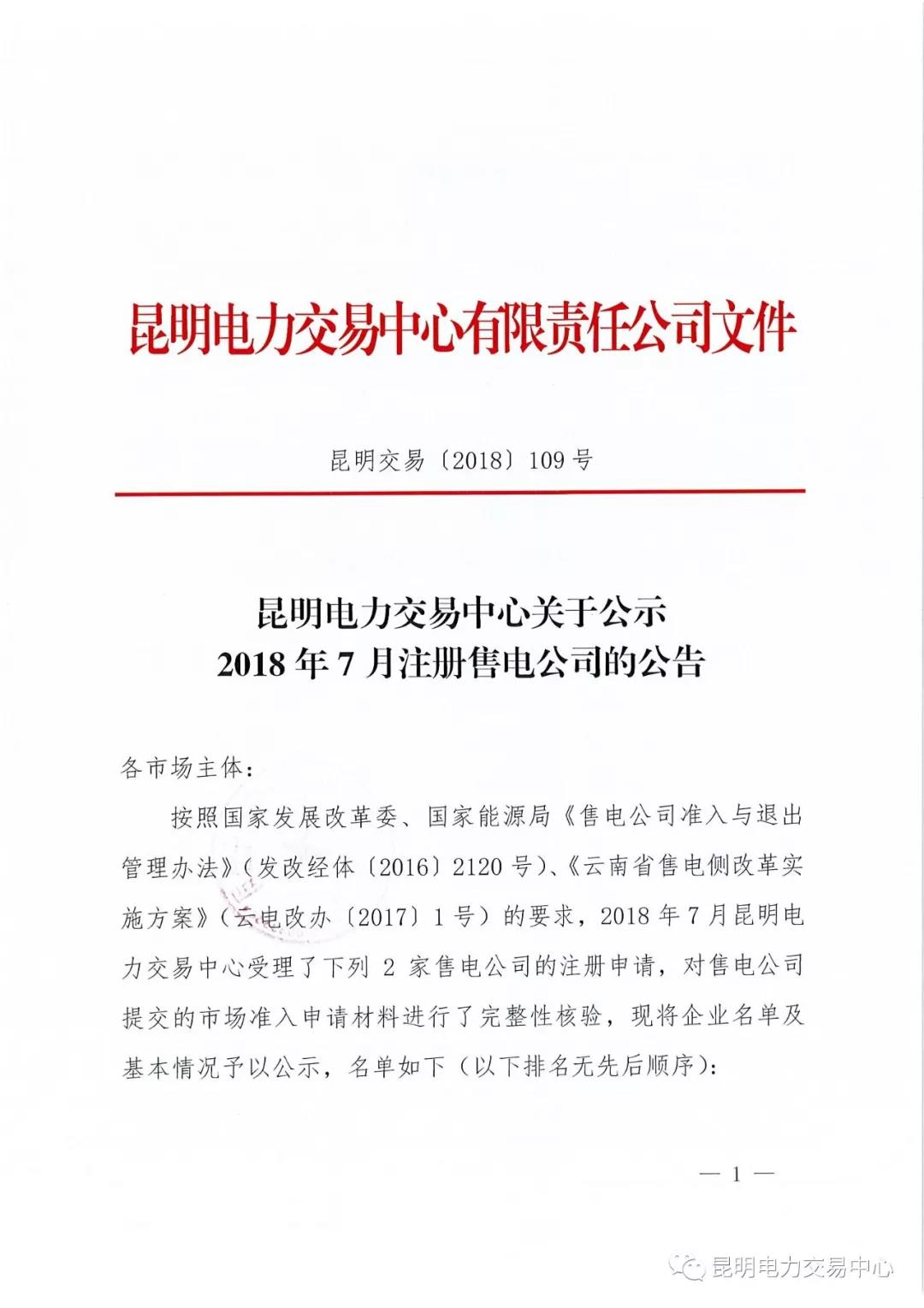 昆明電力交易中心關(guān)于公示2018年7月注冊售電公司的公告