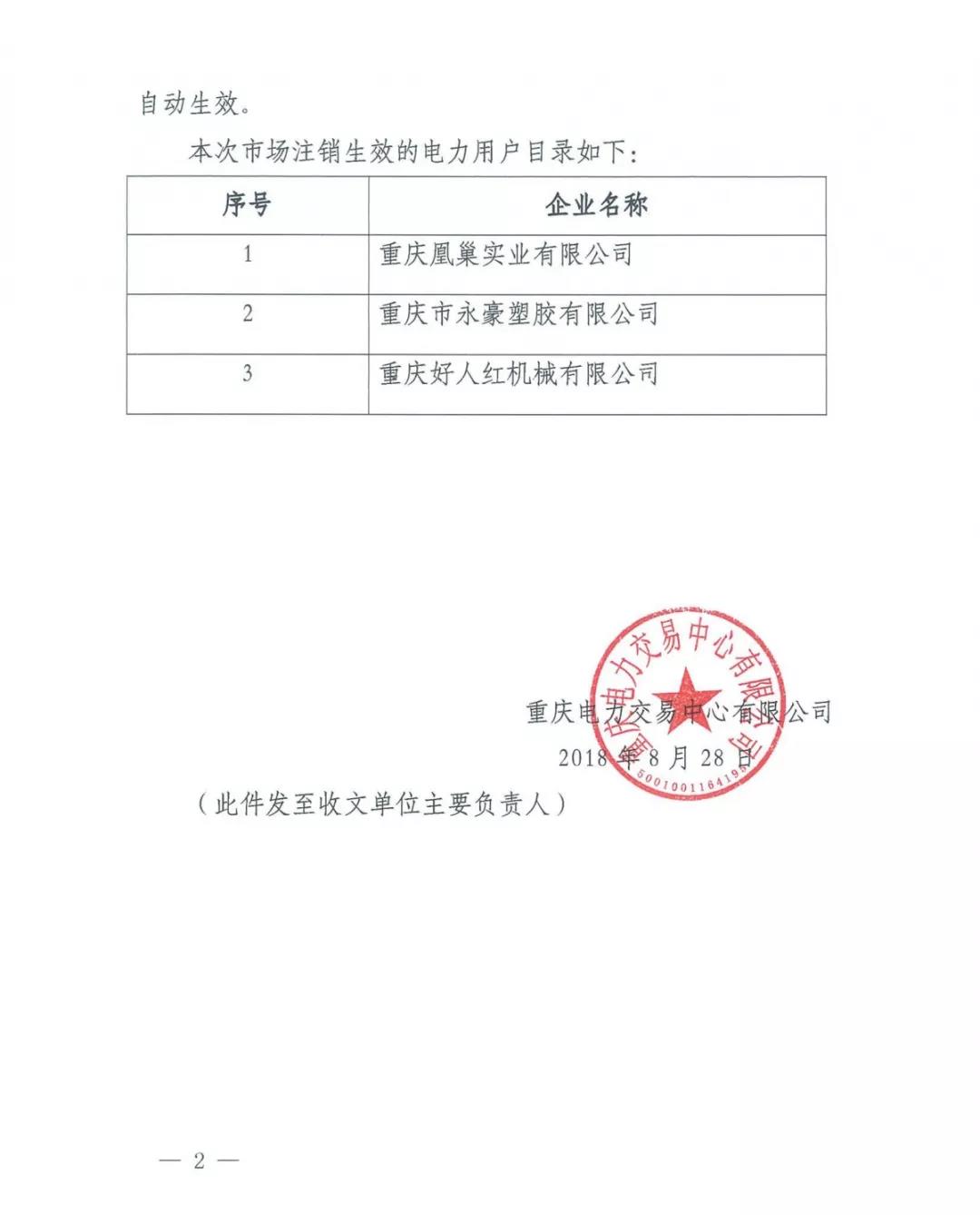 按照國家發(fā)改委、國家能源局《電力中長(zhǎng)期交易基本規(guī)則(暫行)》(發(fā)改能源〔2016〕2784號(hào))及《重慶市電力直接交易規(guī)則(試行)》(渝經(jīng)信發(fā)〔2016〕72號(hào))等文件精神,重慶電力交易中心有限公司于2018年8月22日至8月27日對(duì)重慶凰巢實(shí)業(yè)有限公司等3家電力用戶市場(chǎng)注銷申請(qǐng)進(jìn)行了公示。