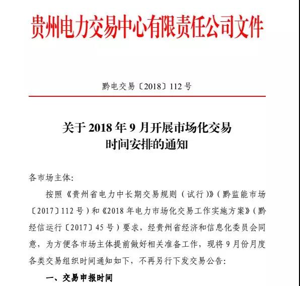 貴州關(guān)于 2018 年9月開展市場(chǎng)化交易時(shí)間安排的通知