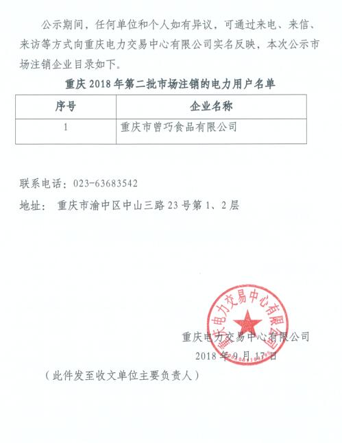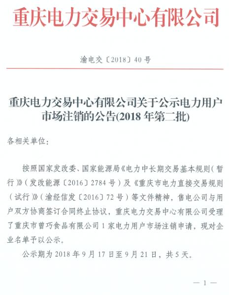 重慶電力交易中心日前發(fā)布了《關(guān)于公示電力用戶市場注銷的公告(2018年第二批)》,重慶市曾巧食品有限公司1家電力用戶擬退出電力市場,公示期為9月17日至9月21日,共5天。