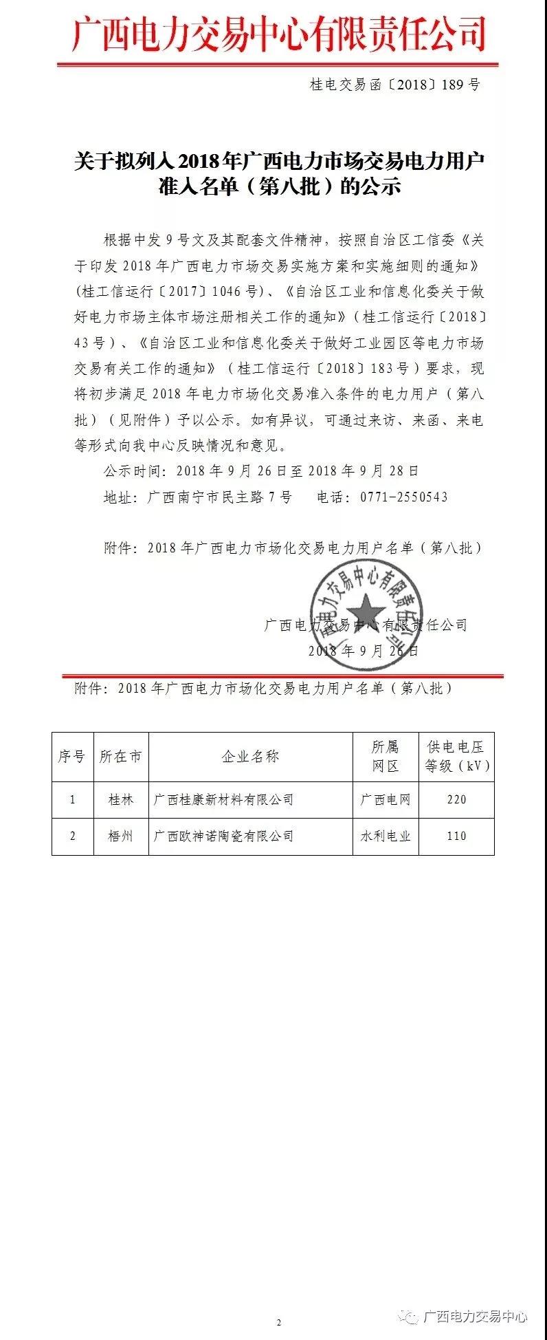 關(guān)于擬列入2018年廣西電力市場(chǎng)交易電力用戶(hù)準(zhǔn)入名單(第八批)的公示