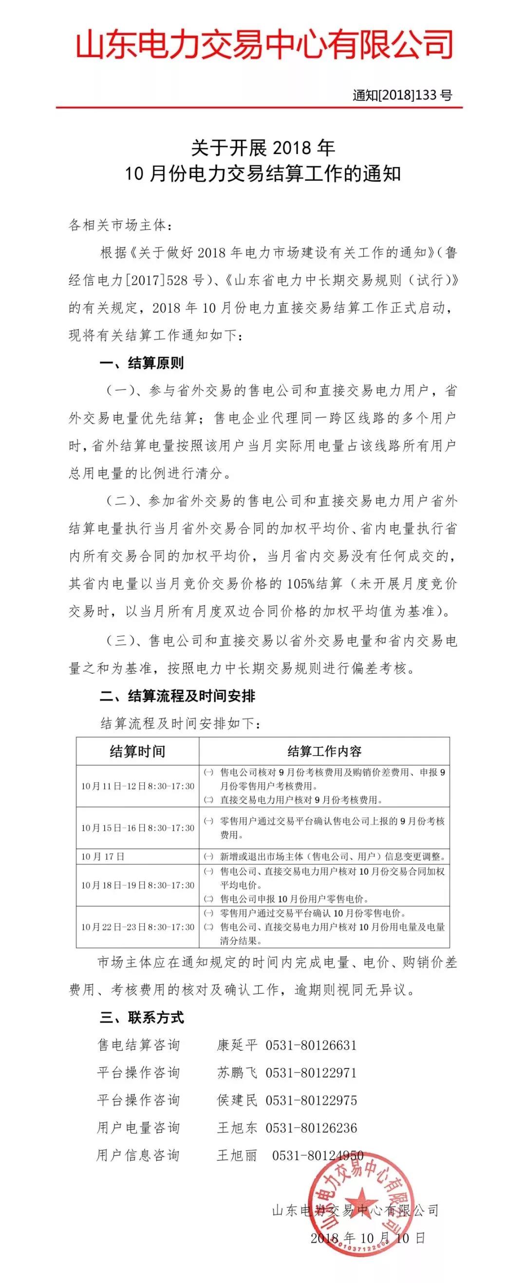 山東開展10月份電力交易結(jié)算通知