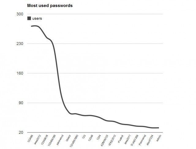 德拉古辛提供的分類數(shù)據(jù)顯示,部分密碼被大量IEEE會員使用,只需利用Hashcat和JohntheRipper等簡單解密工具,這些密碼在不到1秒鐘時間內(nèi)就能被破譯。密碼“123456”被使用了271次,“ieee2012”、“”、“9”和“password”被使用的次數(shù)分別是270、246、222和109次。