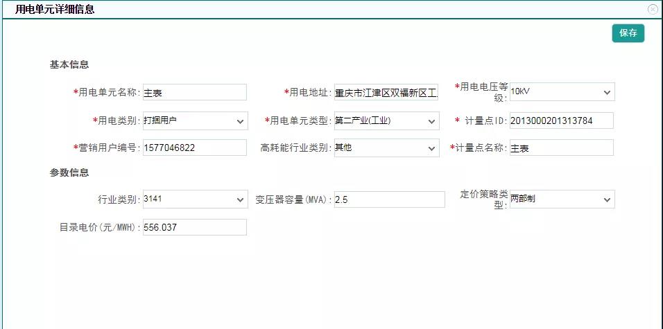 點(diǎn)擊用電單元名稱,進(jìn)行用電單元信息界面,補(bǔ)充完整用電單元信息(用電單元類型、高耗能行業(yè)類別需重新選擇),后保存即可。
