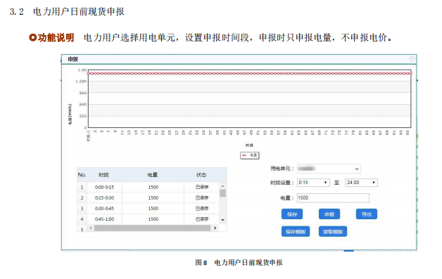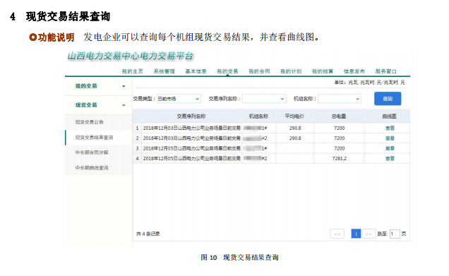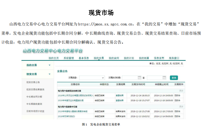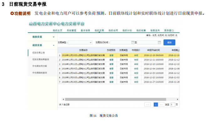 另外印發(fā)了現(xiàn)貨申報(bào)操作手冊:發(fā)電企業(yè)現(xiàn)貨功能包括中長期合同分解,中長期曲線查詢、現(xiàn)貨交易公告、現(xiàn)貨交易結(jié)果查詢、日前市場預(yù)計(jì)收益;電力用戶現(xiàn)貨功能包括中長期合同分解確認(rèn)、現(xiàn)貨交易公告。