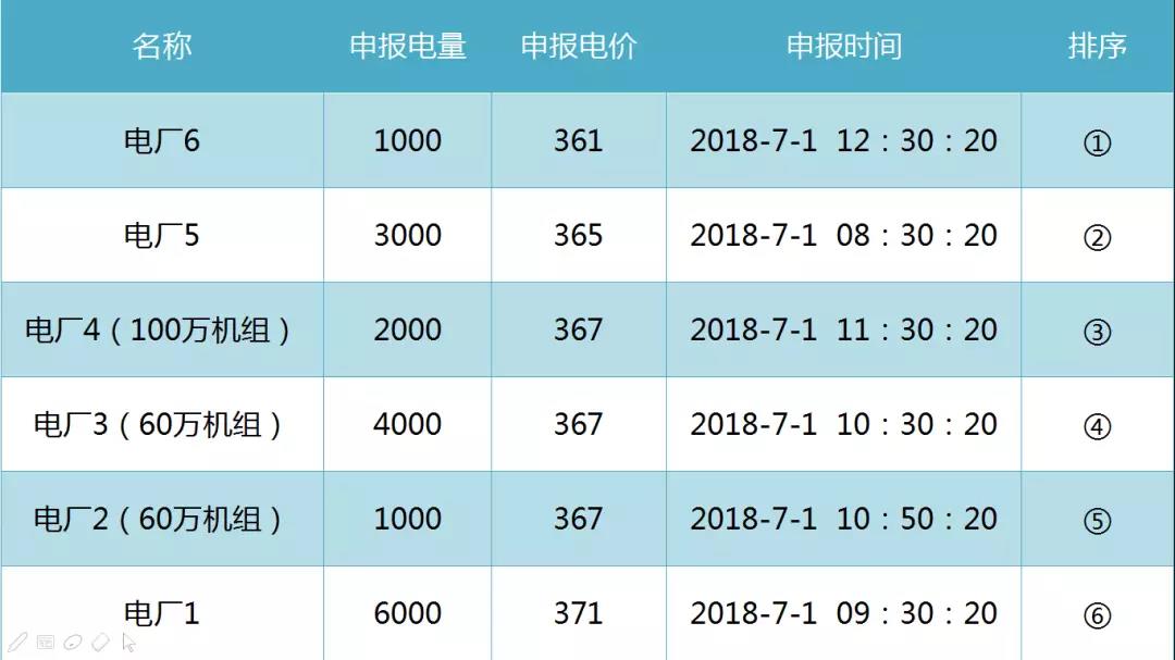 成交順序因素按電廠價(jià)格升序、容量降序、時(shí)間升序排列,電力用戶按價(jià)格降序、申報(bào)時(shí)間升序排列。