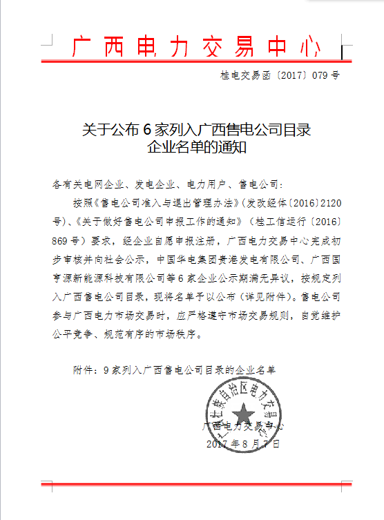 關(guān)于公布6家列入廣西售電公司目錄企業(yè)名單的通知
