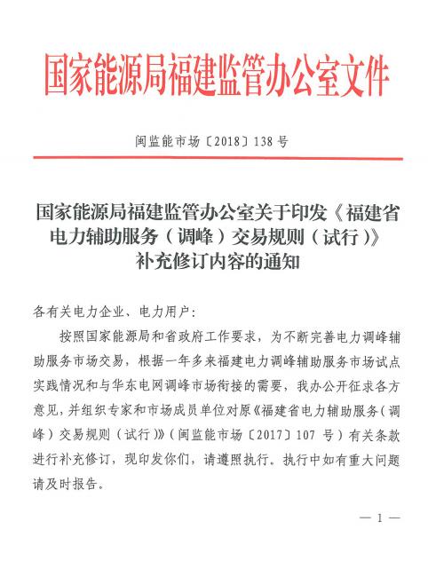 福建能監(jiān)辦發(fā)布了關(guān)于印發(fā)《福建省電力輔助服務(調(diào)峰)交易規(guī)則(試行)》