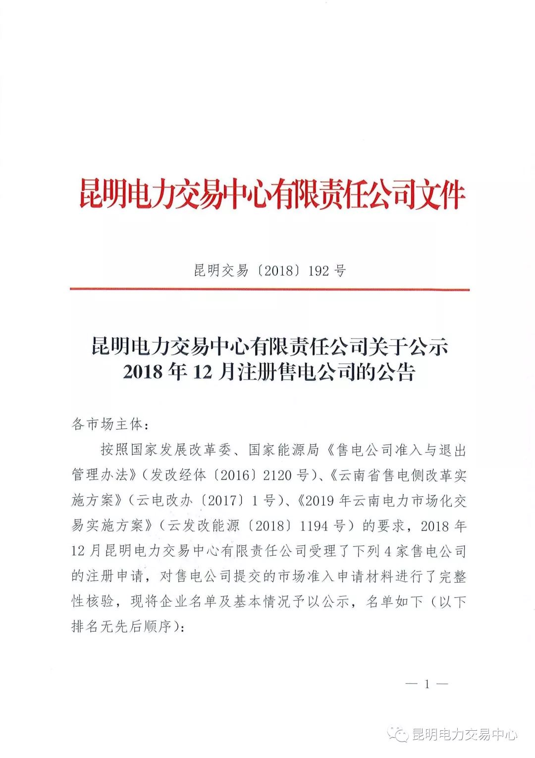 昆明發(fā)布了《關(guān)于公示2018年12月注冊售電公司的公告》