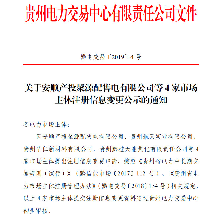 貴州電力交易中心日前發(fā)布了《關(guān)于安順產(chǎn)投聚源配售電有限公司等4家市場主體注冊信息變更公示的通知》,公示申請注冊信息變更的1家售電公司和3家電力用戶,公示期為2019年1月4日至1月17日,時間10個工作日。