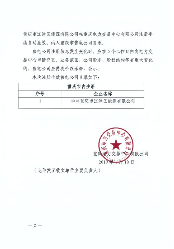 重慶電力交易中心日前發(fā)布了《關于公布售電公司公示結果的公告(2018年第十二批)》,華電重慶市江津區(qū)能源有限公司在重慶電力交易中心有限公司注冊手續(xù)自動生效,納入重慶市售電公司目錄。