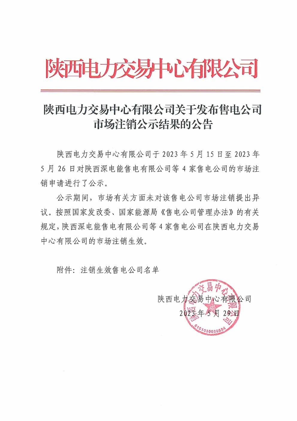 日前陜西電力交易中心有限公司關(guān)于發(fā)布售電公司市場注銷公示結(jié)果的公告。詳情如下: