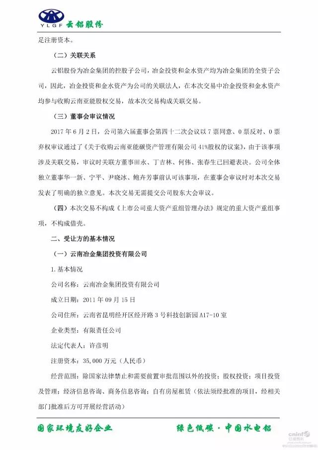 6月2日,云南鋁業(yè)股份有限公司發(fā)布關于收購云南亞能碳資產管理有限公司41%股權的公告,交易完成后該公司將以41%股權成為云南亞能第一大股東。晶見第一次注意云南鋁業(yè)這個大企業(yè)是其作為電力大用戶逆向收購了國電電力在云南的三家水電廠,為了貫徹其“水電鋁加工一體化產業(yè)鏈”戰(zhàn)略,而這一次控股云南亞能則是對這個戰(zhàn)略的補充,也是順應國家低碳清潔的能源發(fā)展戰(zhàn)略,完善公司綠色低碳“水電鋁加工一體化產業(yè)鏈”。