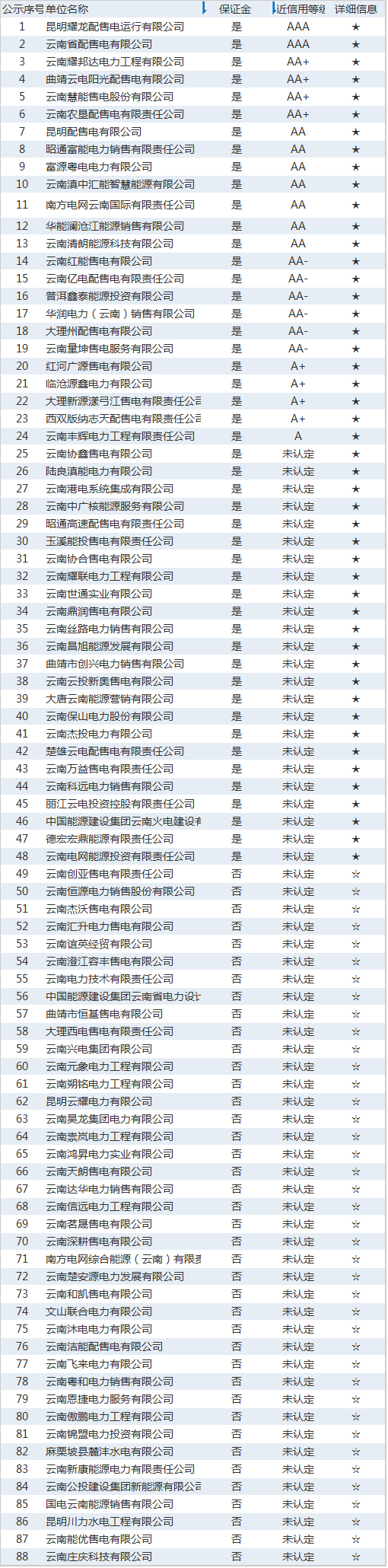 昆明電力交易中心日前發(fā)布了《云南電力市場售電公司目錄及相關(guān)信息》,截至目前,云南售電公司共有88家,其中繳納保證金的售電公司有48家。詳情如下: